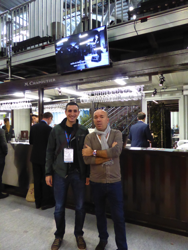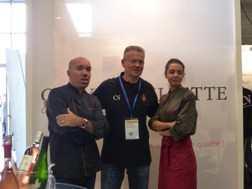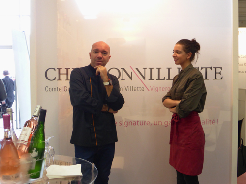 Jacques Pourcel et Camille Martin, une de leurs assistantes en cuisine, sur le Stand de Chevron/Villette producteurs vignerons en Côtes de Provence, où durant les 3 jours du salon les clients des Domaines pouvaient déguster leurs vins accompagnés d’un plat cuisiné sur place par le Jardin des Sens.