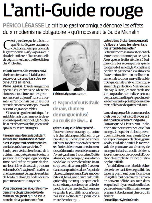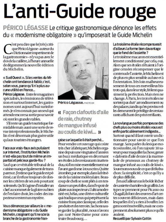 Comme chaque année, le journaliste et chroniqueur gastronomique Périco Légasse pousse son coup de gueule avec verbe et couleur au moment de la sortie du guide Michelin. Son analyse est toujours pertinente et fort à propos, mais comme » on ne peut pas plaire à tout le monde » il faut pouvoir considérer chaque créneau que propose la restauration française. Lui est fervent défenseur de la cuisine terroir et bistrot qui plaît beaucoup, bien évidemment, mais la cuisine créative et novatrice a aussi ses amateurs et ils sont nombreux. Donc évitons le terrorisme culinaire et laissons les chefs s’exprimer, les clients choisiront.