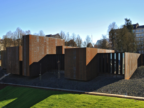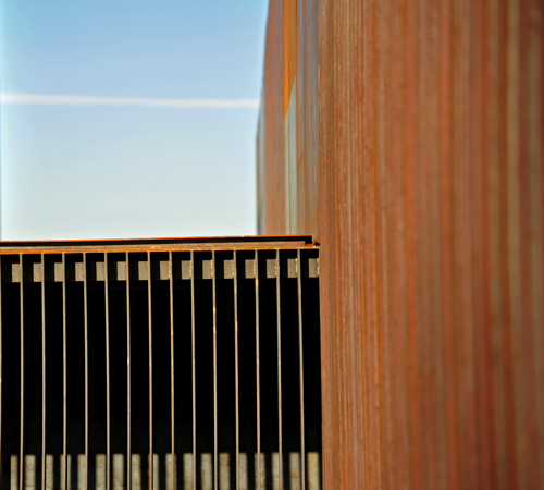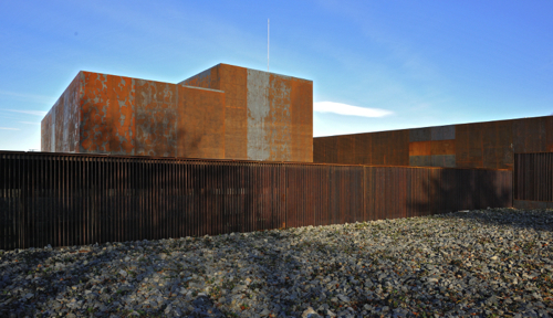 Le bardage est d’acier Corten ou acier auto-patinable. En s’oxydant, ce matériau créé une patine protectrice, les nuances de cet acier évoquent aussi le travail de Pierre Soulages.