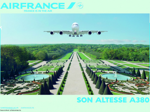 Le nouveau fauteuil de la classe Business est transformé en chaise à porteur, planté au milieu du parc de Versailles sous le titre » un confort révolutionnaire » ou » son altesse l’A380 » avec un gros jumbo survolant les jardins de Versailles.