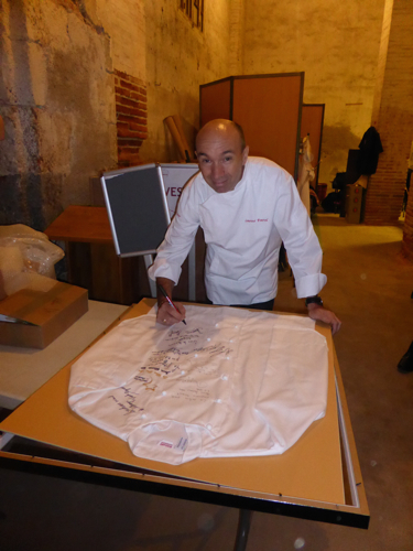 Signature par le chef Laurent Pourcel de la veste des chefs de cuisine qui sera vendue aux enchères.