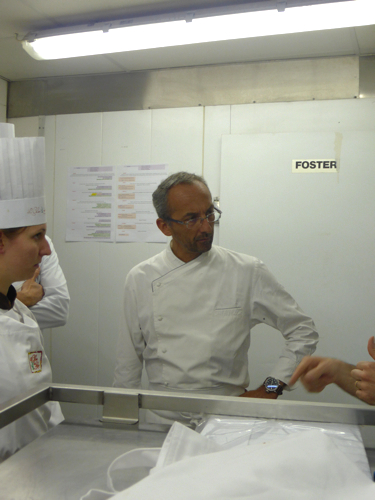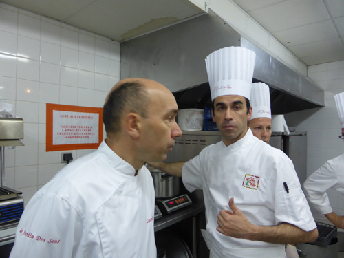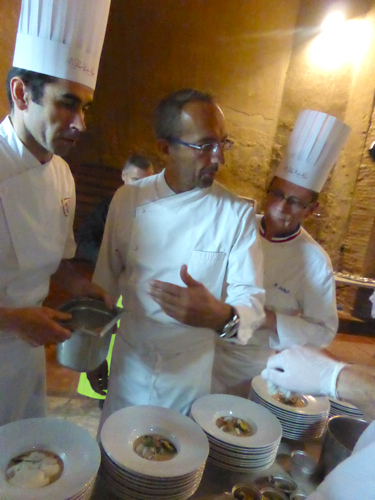 En cuisine réunion avec toutes les équipes et briefing, c’est le chef Franck Séguret du Clos des Lys, qui est aux commandes, ci-dessus en compagnie du chef Marseillais Michel Portos.