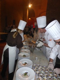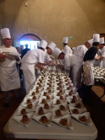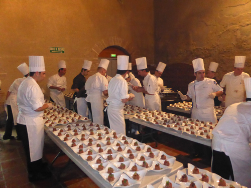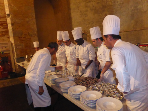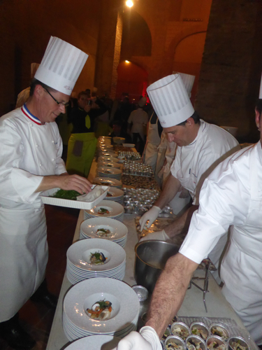 Ce sont d’abord les chefs qui sont arrivés, ils ont rejoint la quarantaine de cuisiniers déjà sur place pour prêter main forte, les équipes du » Clos Des Lys « bien sûr, mais aussi beaucoup de cuisiniers de toute la région qui étaient venus de façon bénévole pour aider à la réalisation du dîner.