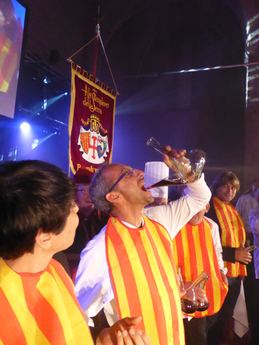 C’est toujours un grand moment une intronisation par une confrérie vineuse, dans la pure tradition Catalane, les chefs ont dû goûter au vin de l’année en le buvant depuis un » porro catalan » ( pichet à vin traditionnel ).