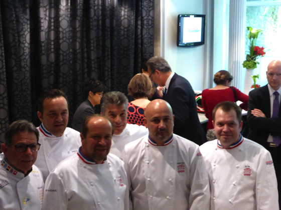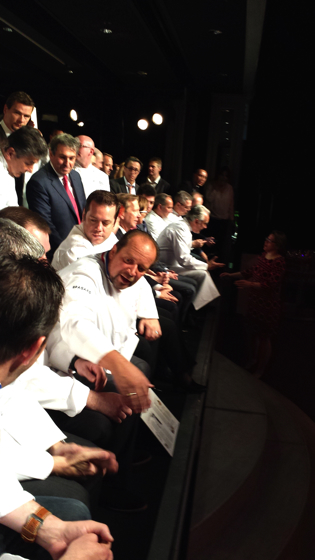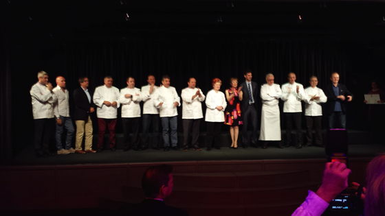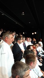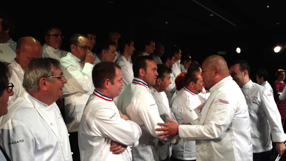 Salle comble bien évidemment pour un évènement qui donne l’occasion aux chefs de toute la France de se retrouver pour fêter les nouveaux venus dans la grande famille de la gastronomie française. Les premières photos fusent, ci-dessus, les chefs Marcel Lesoille, Gilles Goujon, Frédéric Anton, Régis Marcon, Éric Prat, ….