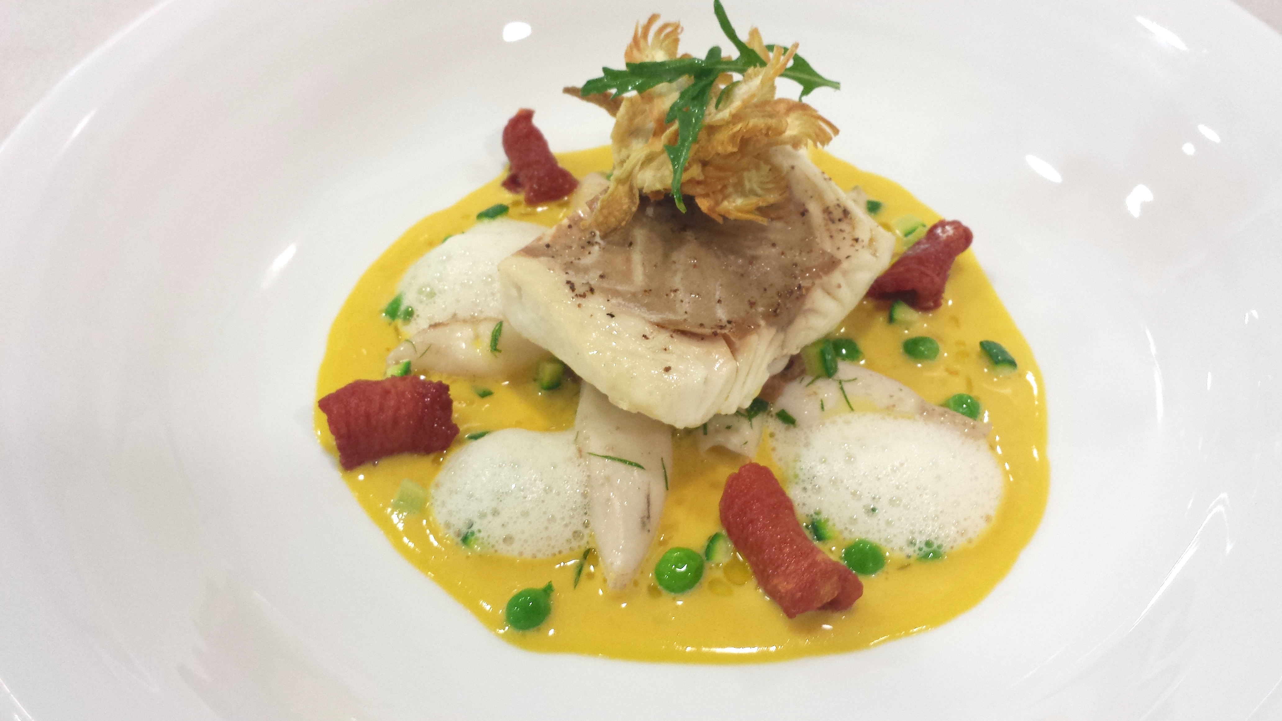 Recette de la semaine : Filet de loup cuit au four, pistes de pays juste poêlés, jus safrané et chips d’artichauts.
