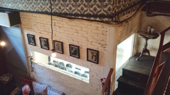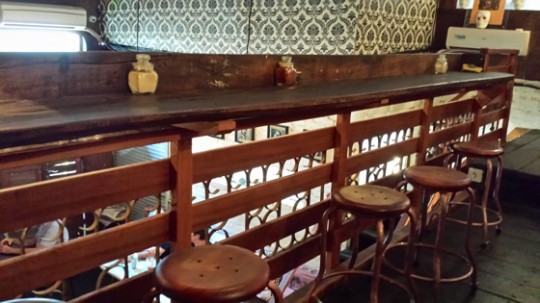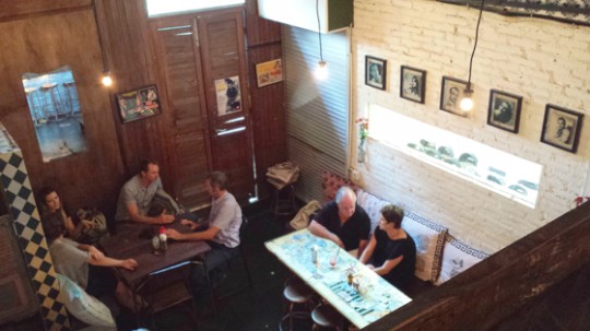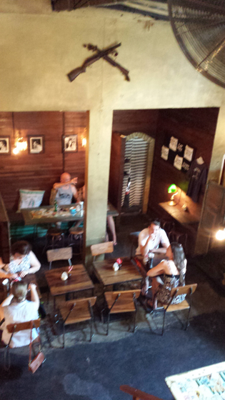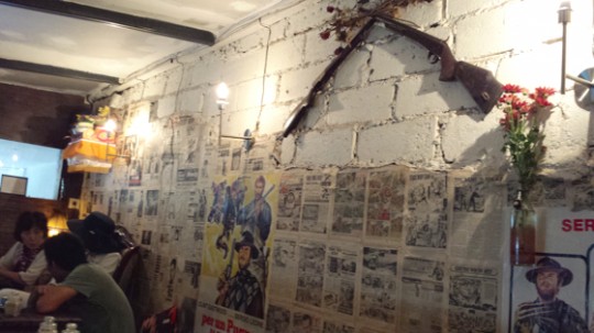 Murs bruts, photos anciennes, pages de journaux anciens collés aux murs, papiers peints vintage, beaucoup de bois anciens, une mezzanine, du béton lissé et quelques tables joliment imaginées. L’esprit des western de Sergio Leone et les musiques de Ennio Morricone planent.