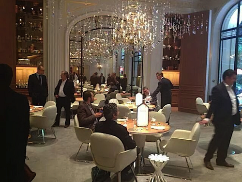 Côté mise en scène – idem – les maîtres d’hôtel sont vêtus de blanc, les tables quand à elles regardent toujours vers la cour intérieure, mais pas seulement puisque dorénavant vous pouvez même apercevoir une partie des cuisines, les couverts sont en bois et en inox… quand aux lustres si ils furent un temps caché d’un voile métallique, ils sont maintenant éclatés, déstructurés même donnant beaucoup d’éclat à l’ensemble de la salle Régence.