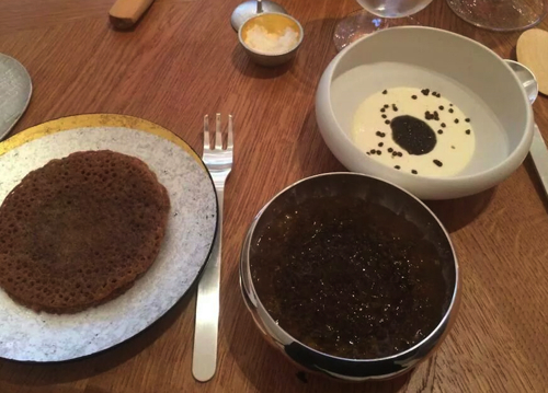 Casser les codes – c’est un peu le message qui se diffuse ici, la salle est totalement restaurée, impressionnant travail réalisé par le designer Patrick Jouin fidèle partenaire du chef dans tous ses projets. Comme dans la précédente salle, le restaurant est resté dans son jus, l’histoire habite le lieu. Ce qui change c’est l’habillage, contraste de matière et de formes, mariages inattendus, la mise de table par exemple, exit les nappages sur les tables, le chêne naturel a pris le relais, la céramique et la terre cuite ont fait leurs apparitions…