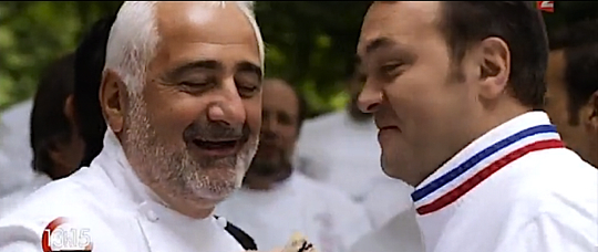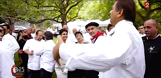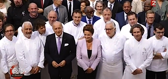 En tête d’affiche, quelques trois étoiles comme Guy Savoy, Guy Martin, Gérald Passedat, Arnaud Lallement, Marc Haeberlin Emmanuel Renaut, Gilles Goujon, Patrick Bertron et Alain Ducasse qui entourent Laurent Fabius.