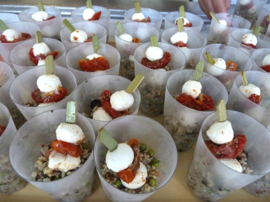 Verrine de quinoa bio, vinaigrette agrumes, brochette de mozzarella et tomate confite