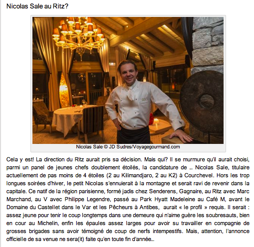Concernant le chef Nicolas Sale, le chef annonce aussitôt la diffusion de la rumeur sur son possible départ pour le Ritz, qu’il a démenti, et qu’il ne bougera pas de Courchevel. Link Facebook