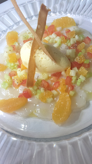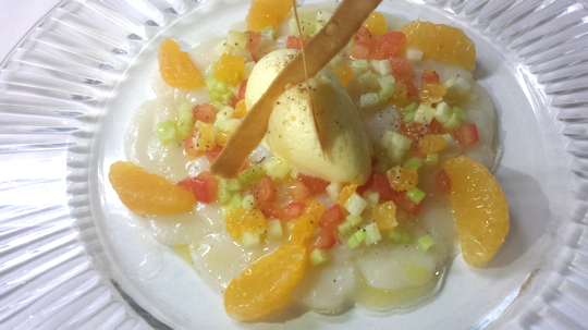 Carpaccio de noix de Saint-Jacques, vinaigrette aux condiments, croquant de clémentine et sorbet clémentine au poivre de Sichuan.