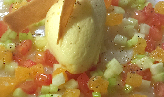 Le cru de la noix de Saint-Jacques, le sorbet très rafraîchissant, à la maison c’est une entrée qui vous prendra peu de temps, si vous réalisez le sorbet par avance. À défaut de sorbetière, n’hésitez pas à réaliser un granité avec la même recette mais sans y incorporer les blancs d’oeuf.