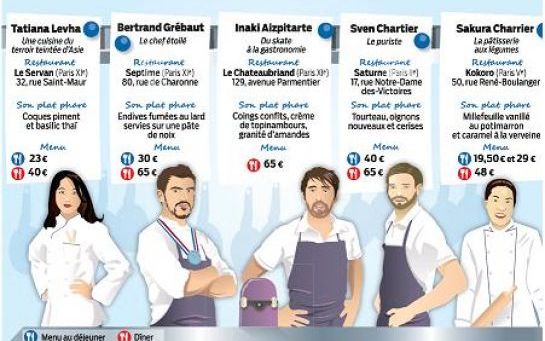 Le Parisien : Sven Chartier, Björn Frantzen, Bertrand Grébaut, Tatiana Levha, Inaki Aizpitarte, Florent Ladeyn… en tout dix chefs … Les nouvelles stars de la cuisine. Des toques qui décoiffent !