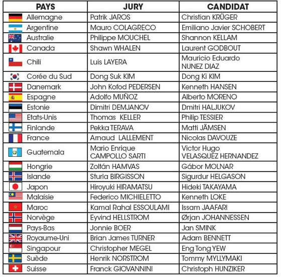Vous trouverez ci-joint la liste complète des candidats, mais aussi des membres du jury par nation. 24 pays y sont représentés, chacun d’eux affichera son équipe avec à sa tête le candidat, chaque pays représenté aura aussi son membre du jury présent.