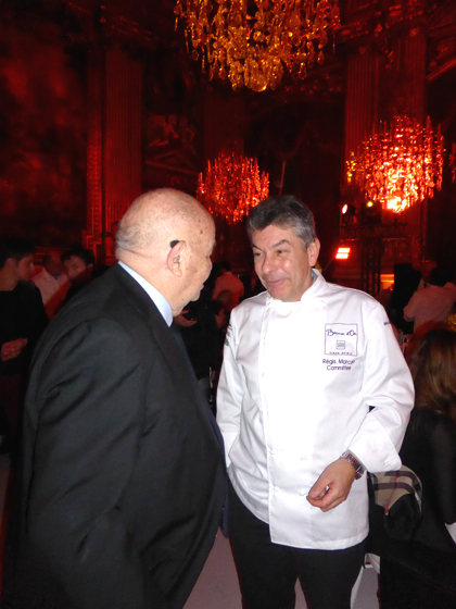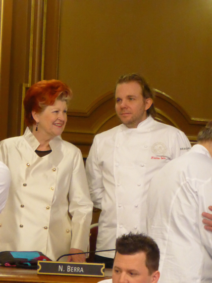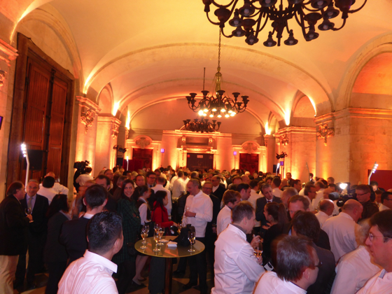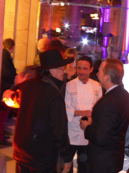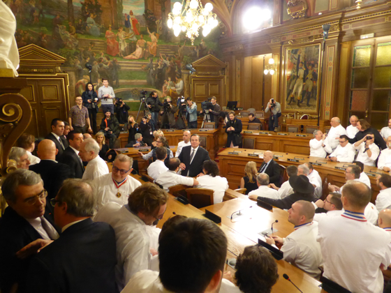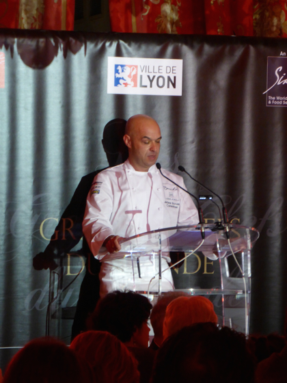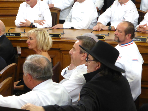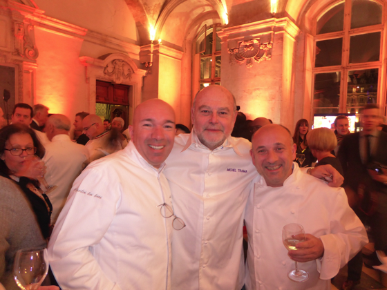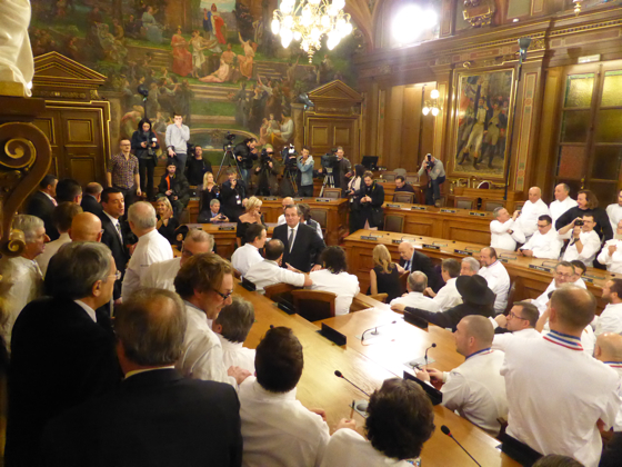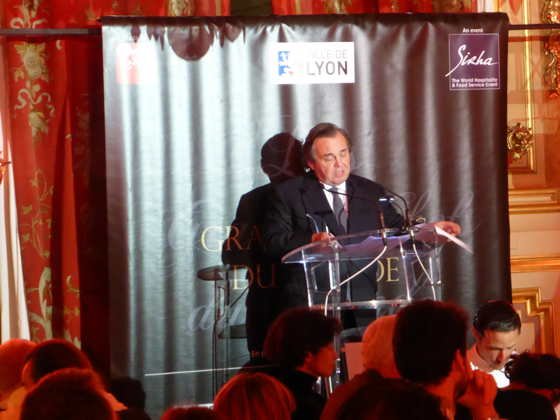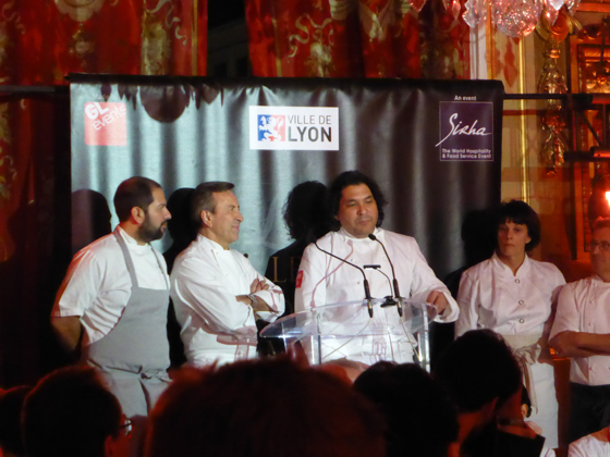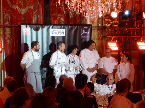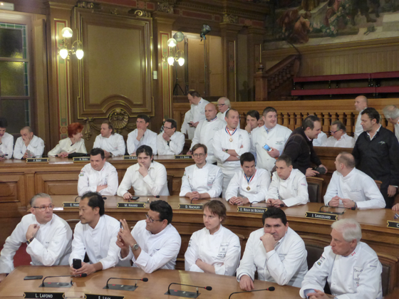Ensuite les chefs rejoignèrent l’impressionnante salle de réception de la Mairie de Lyon, sous les lustres de la Ville, une bonne centaine d’invités attendait les chefs, on y croisa le Préfet de Rhône Alpes, le directeur monde du guide Michelin Mickael Ellis, le vigneron Michel Chapoutier, Paul Vranken des champagne Pommery, Michel Bernardeau de la porcelaine éponyme…