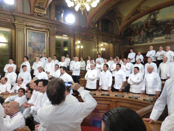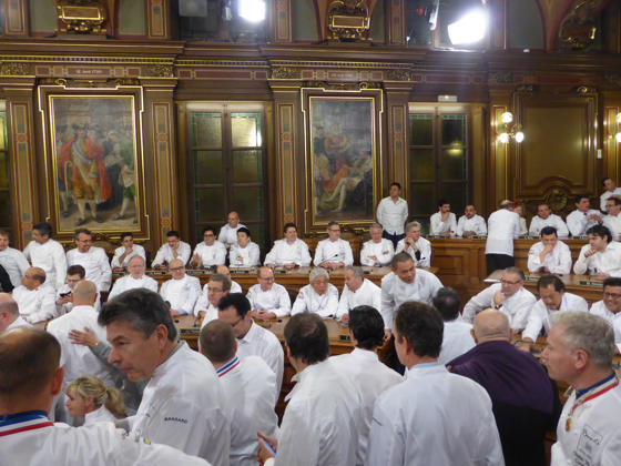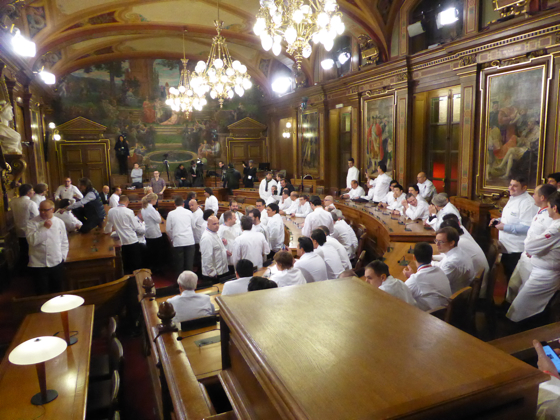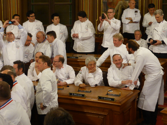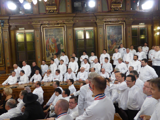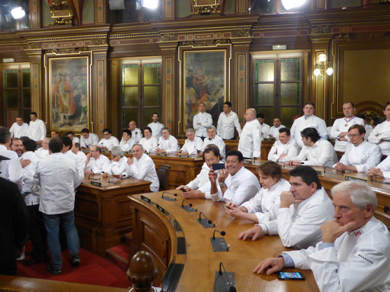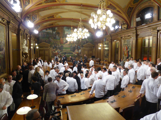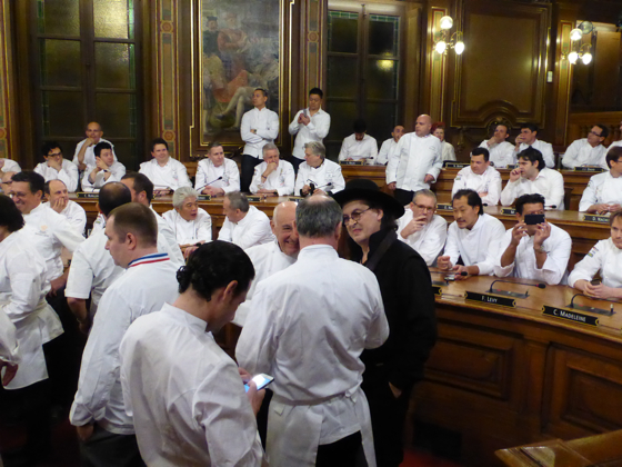 Après l’apéritif pris au rez-de-chaussée de l’Hôtel de ville le tout arrosé de Champagne Pommery et des vins des côtes du Rhône de chez Chapoutier, l’ensemble des chefs de cuisine a rejoint la salle du conseil municipal de Lyon pour la grande photo de famille. Impressionnante photo réunissant plus de 250 étoiles Michelin, 80 % des grands noms de la cuisine mondiale étaient là.
