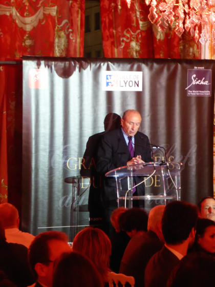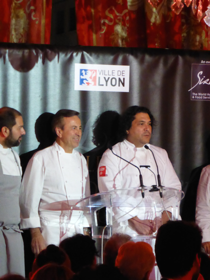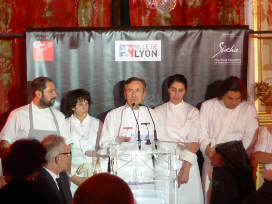 Dans l’Assemblée prestigieuse de la soirée, le Maire de Lyon Gérard Collomb, le PDG de GL Events Olivier Ginon, la Directrice Générale du Sirha et conseillère Municipale de Lyon Marie Odile Fondeur, l’écrivain membre de l’Académie Française Éric Orsena, le chef Jérôme Bocuse fils de Paul, et l’Ambassadeur des États-Unis en France.