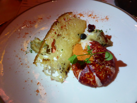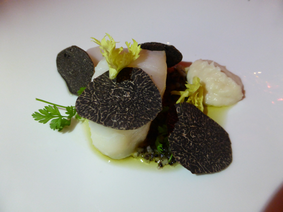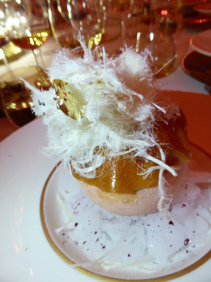 Normand Laprise le chef de Montréal continua par un homard bleu aux pousses et baies de Gapésie, quand la seule chef féminine ce soir là pour les plats salés l’américaine Barbara Lynch elle prépara un cabillaud poché au petit lait accompagné de céleris et truffes noire, un plat totalement dans la finesse et l’excellence.