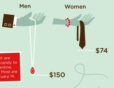 Les hommes dépensent en moyenne 150 us dollars pour leur bien aimée, et les femmes 74 us dollars. Messieurs vous êtes moins gâtés !