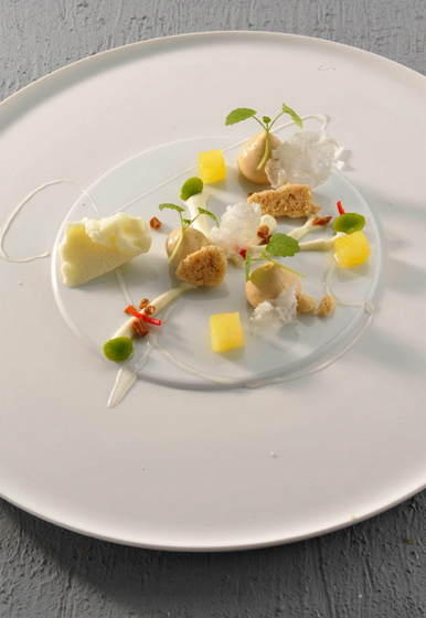 Minimalisme : Dessiner l’assiette, jouer sur les couleurs et texture, ne pas oublier le croustillant et la gelée en cube ( que l’on trouve partout ).