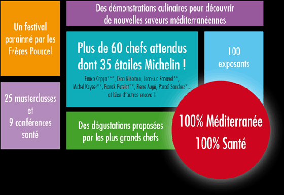 Cet évènement sera la première vraie rencontre des cuisines du bassin de la Méditerranée, une bonne soixantaine de chefs y sont impliqués, parrainé par les frères Pourcel, ce Festival de cuisine grandeur nature se déroulera au Park&Suites Aréna, la plus grande salle de concert de France aménagée pour l’occasion en atelier culinaire.