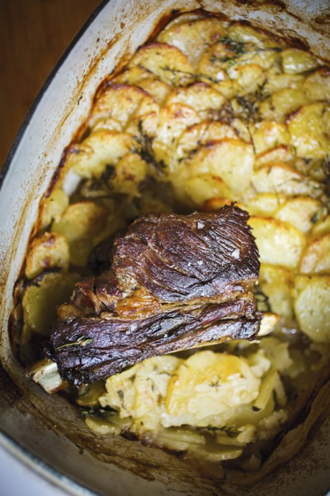 Ingrédients (pour 4 personnes) : 1 kg de pommes de terre (à chair ferme) 1,8 kg de plat de côtes 3-4 feuilles de laurier, 1 gousse d’ail, 1 bouquet de thym frais. Noix de muscade. Sel marin (ou de Maldon). Poivre du moulin. Beurre. Vinaigre de riz. Sauce soja.