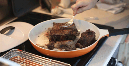 Retirer la viande, mettre le four en position grill, et laisser les pommes de terre griller pendant 15 à 20 minutes supplémentaires. Pendant ce temps-là, faire saisir la viande dans une poêle, avec un peu de beurre. Retirer la viande et la laisser reposer 10 min. Déglacer le jus dans la poêle avec une cuillerée de vinaigre de riz et une cuillerée de soja, et laisser un peu réduire. Servir avec une syrah de Marcel Richaud (Cairanne).