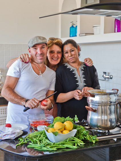 Dans la cuisine de leur maison à Marrakech lors du reportage cuisine, le chef Jacques Pourcel aux fourneaux, Dominique Homs-Vailhé qui a réalisé le sujet pour le magazine Régal et Azizza la cuisinière marocaine.
