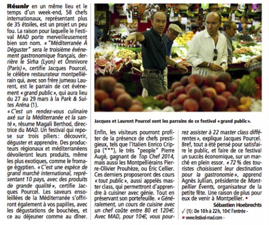 Le festival de cuisine MAD ( Méditerranée À Déguster ) qui se déroule à Montpellier les 27, 28 et 29 mars prochain à Montpellier a été présenté à la presse régionale ce mercredi à Montpellier au restaurant Le Jardin des Sens des Frères Pourcel.