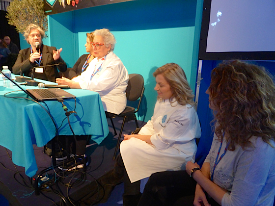De nombreux débats ont eu lieu, comme ici sur le sujet de la transmission culinaire dans les pays bordant la Méditerranée, ci-dessus la chef Fatema Hal, la chef Turque Sévim Gokyildiz et la chef Grecque Dina Nikolaou, tribune animée par Sébastien Ripari.
