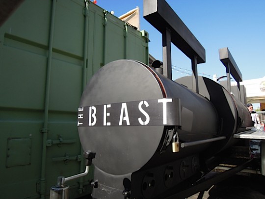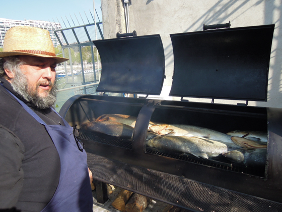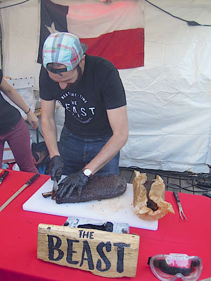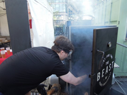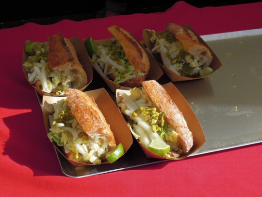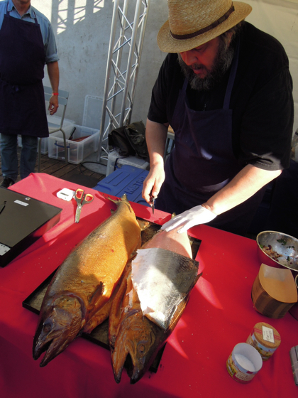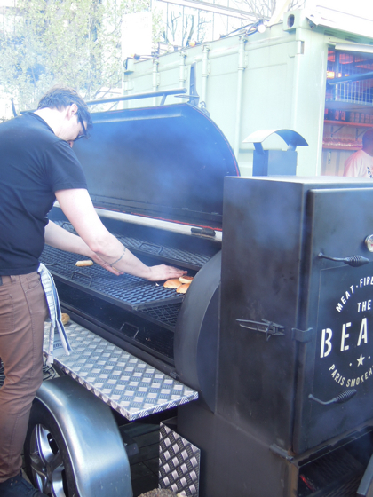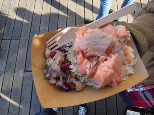 My South Africa, la cantine Sud Africaine avec Kobus Bota, un ancien producteur reconverti et installé à Montreuil a déplacé son imposant Braai (Barbecue géant and Africaans) pour l’occasion. A l’intérieur, 6 magnifiques saumons Label Rouge de 8Kg chacun servi avec du riz et une salade de haricots rouges et pois chiches. Kobus Bota est devenu en quelques mois seulement la référence de la cuisine Sud Africaine en France et participe à de nombreux évènements. A suivre.