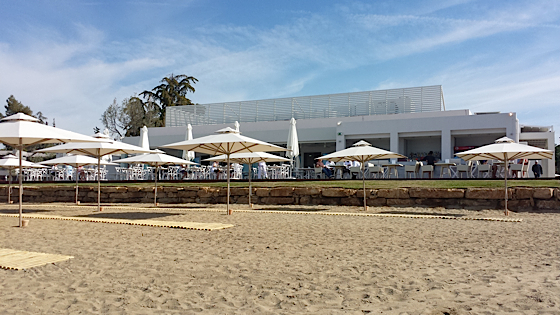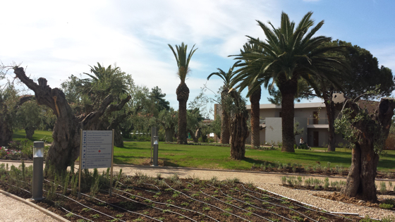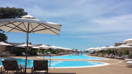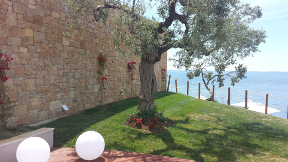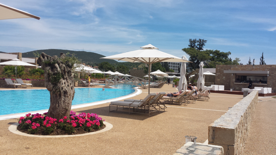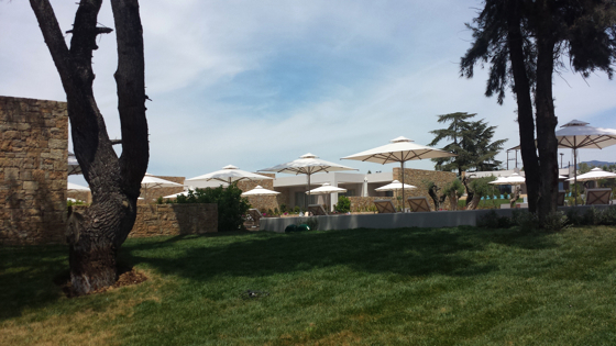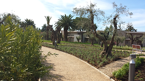Quelques touches de couleur, le rouge des géraniums. Le vert de la pelouse, des jardins, des oliviers, palmiers et autres arbres, promesses d’ombre et d’intimité. Le bleu du ciel et de la mer, des piscines entourées de lits de repos blancs, blancs, blancs. Un hôtel design et épuré, les pieds dans l’eau, parfaitement intégré au paysage.