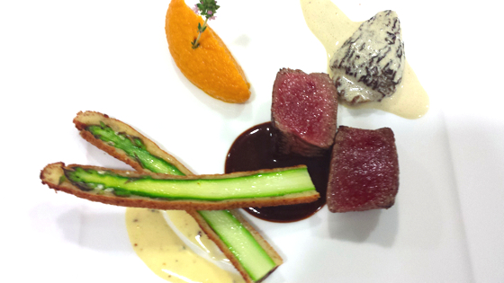 La pièce de bœuf rôtie, asperges croquantes panées, morilles à la crème légère, jus de morilles, béarnaise estragon, fine purée de carottes à l’orange