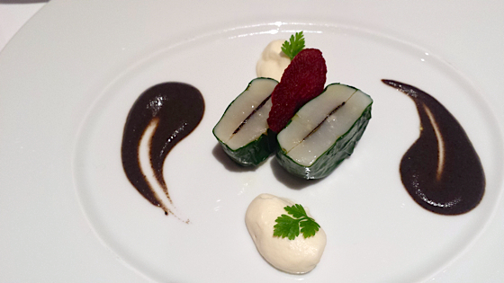 Escalope de NISHIGAI et de calamar marinière, l’espuma de hoummos, lard séché.