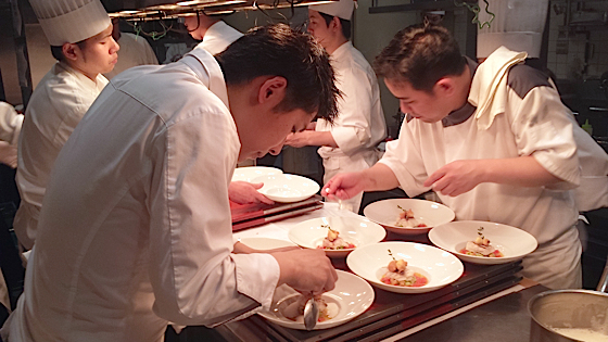 Des collaborateurs des différents restaurants du groupe Hiramatsu sont venus prêter main forte en cuisine; plus de trente cuisiniers oeuvrent pour le bon déroulement de la soirée, autant en salle, un beau moment d’échange et de plaisirs gastronomiques.