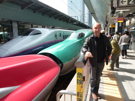 Le chef Laurent Pourcel devant les impressionnants Shinkansen… ancienne et nouvelle version …