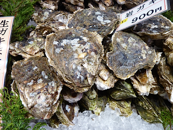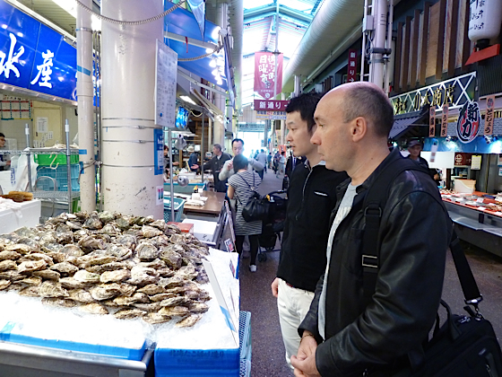 Nous commençons par le rayons des huîtres, ici les huîtres sont énormes, 2 pièces au kilo, elles ont des coquilles très épaisses, l’huître elle-même est très gouteuse, charnue et très ferme. J’en profite également pour goûter des crevettes crues, presque frémissantes, c’est délicieux. Aucune de mes impressions n’échappent aux caméras !