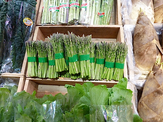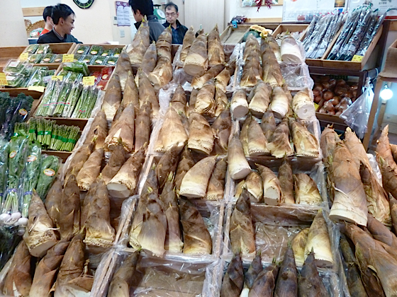 Sur les étals, les légumes de saisons s’exposent, les asperges bien sûr, un peu comme en France, même si elles sont moins parfumées, et ces énormes pousses de bambou, c’est la période de pousse, ici c’est une spécialité régionale très prisée. On dit ici que la région de Kanazawa c’est le potager du Japon.