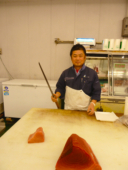 Un petit passage par le rayon des » samouraï » du Thon, ils sont toujours très impressionnants avec leur longues lames et cette maîtrise du geste de coupe, unique dans ce pays.