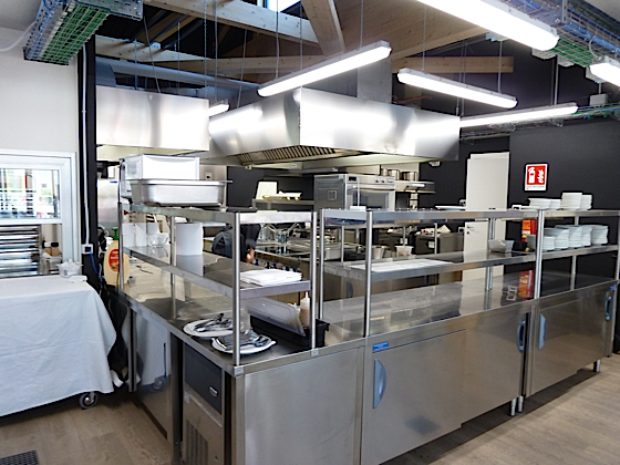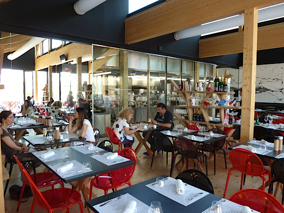À l’intérieur le choix des tables rectangles alignées fait un eu trop cantine, mais l’originalité de design l’emporte, la vue sur la cuisine vitrée et le bar très original à l’entrée donne vie au lieu.