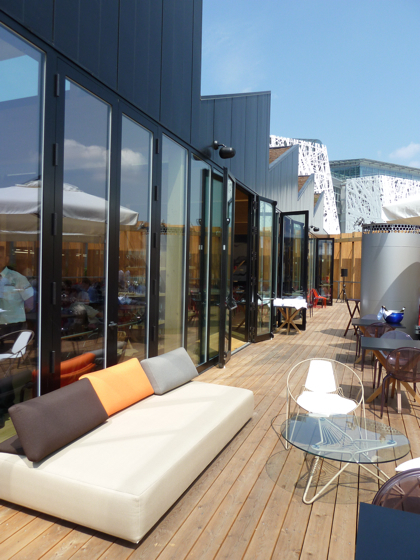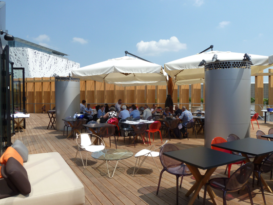 Vous pourrez accéder directement sur le toit du pavillon pour rejoindre le » Café des Chefs « , la table du Pavillon France.