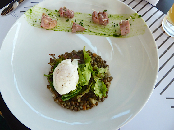 Un plat à la carte : Salade de lentilles du Puy AOC, oeuf poché, brunoise de canette.
