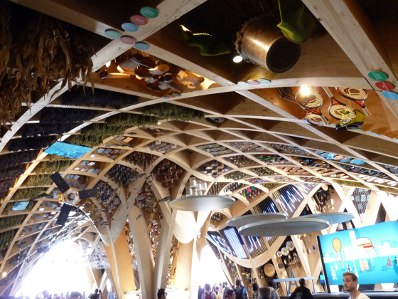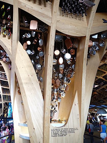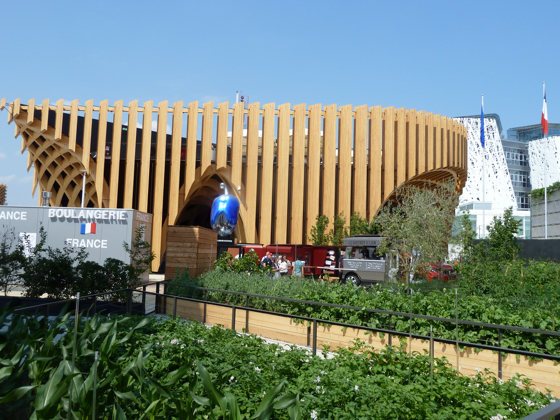 Le magazine Le Point résume ainsi le pavillon France : « Un paysage collinaire et varié typique de la France, mais renversé. Un espace d’accueil qui s’inspire des halles de Baltard, lieu d’échange par excellence et point de rencontre entre tous les maillons de la chaîne alimentaire. » C’est ainsi qu’Anouk Legendre, l’un des deux architectes du pavillon de France de l’Expo universelle de Milan avec Nicolas Desmazières, narre sa création. Si la symbolique lui échappe, le visiteur est immédiatement saisi par la force du bâtiment et la douceur de ses courbes. Construit en épicéa du Jura, le pavillon est en effet un ensemble de 2 000 pièces de bois courbes différentes et assemblées par un système de chevilles invisibles. Un exploit de l’entreprise Simonin qui a fabriqué ce monstre de bois pesant 1 000 tonnes et transporté par 80 camions en moins d’un an.