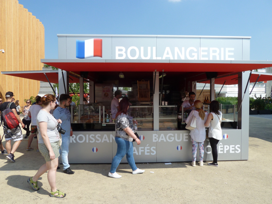Un stand boulangerie est installée à l’extérieur du pavillon France, il propose du pain, des sandwichs, des crêpes….
