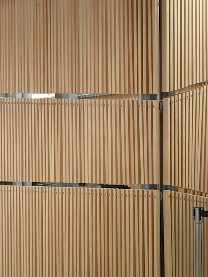 Une grande partie des étroits couloirs qui mènent à la première salle de projection est recouverte de lamelles de bois suspendus, que les visiteurs remuent sans cesse ce qui crée une ambiance sonore assez impressionnante.