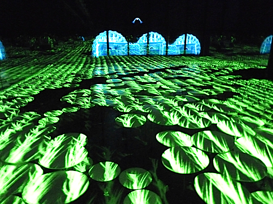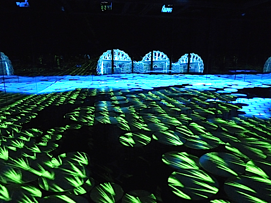 Vous pénètrerez dans plusieurs salles dont une est totalement noire, à l’intérieur des assiettes blanches en suspension habillent une partie de l’espace. sur les murs et les assiettes sont projetés des images en évolutions.