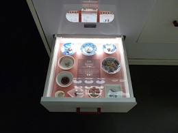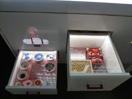 Ensuite c’est la série des tiroirs que vous pourrez ouvrir, ils s’éclairent et laissent apparaitre des plats typiques japonais, mais aussi des produits liés à la tradition culinaire japonaise. C’est assez ludique d’autant que certains des produits présentés sont détournés pour être des accessoires pour les mobile phone.