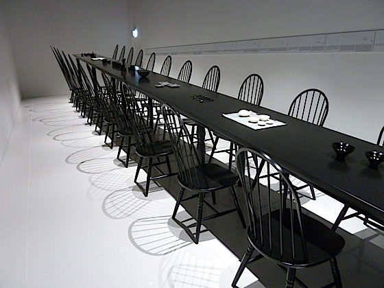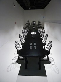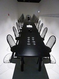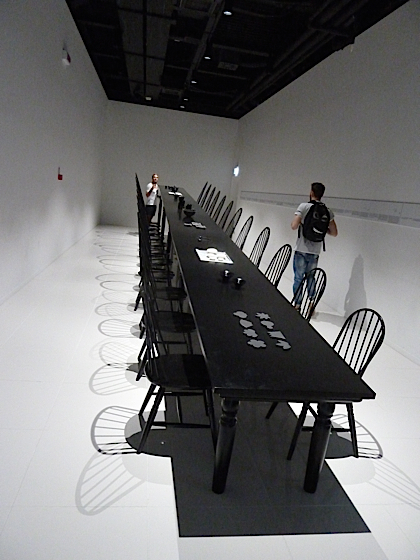 La table démarre à environ 2 mètres de haut, les dossiers de chaises eux aussi suivent la hauteur de la table. Quand aux assises des chaises, elles, sont toujours à la même hauteur, ce qui donne un aspect disproportionné à la table, d’autant que le sol est partout au même niveau.